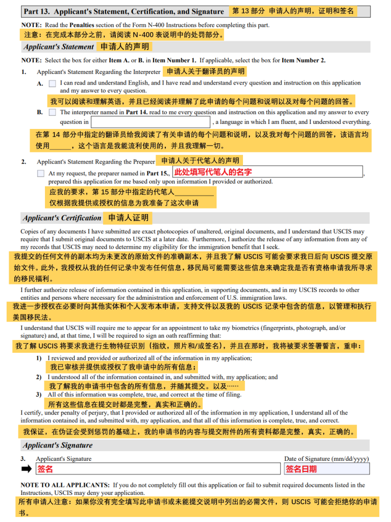 N-400入籍表格的填写样本 - Part13.申请人的声明