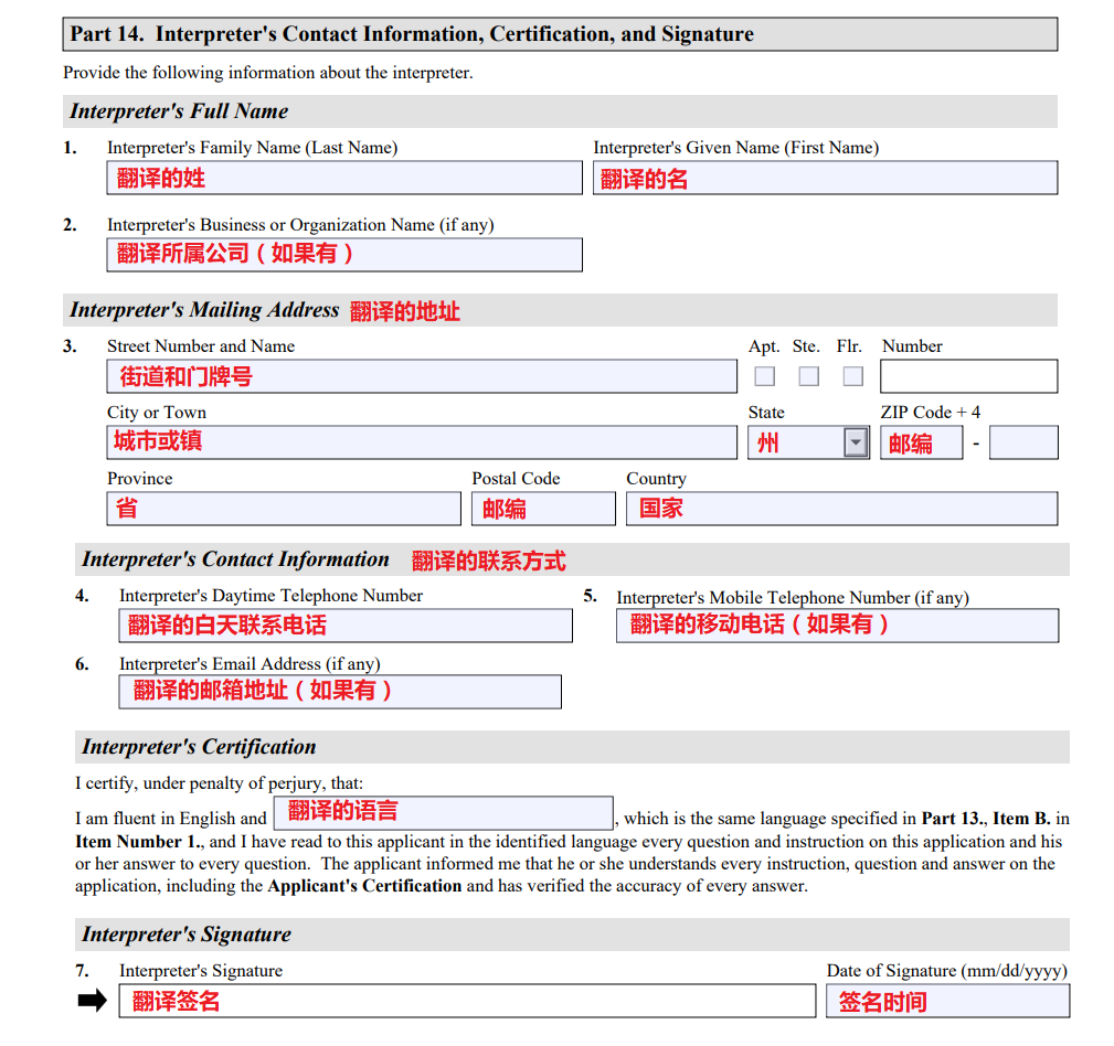 N-400入籍表格的填写样本 - Part14.您聘请的翻译(如有)的相关信息