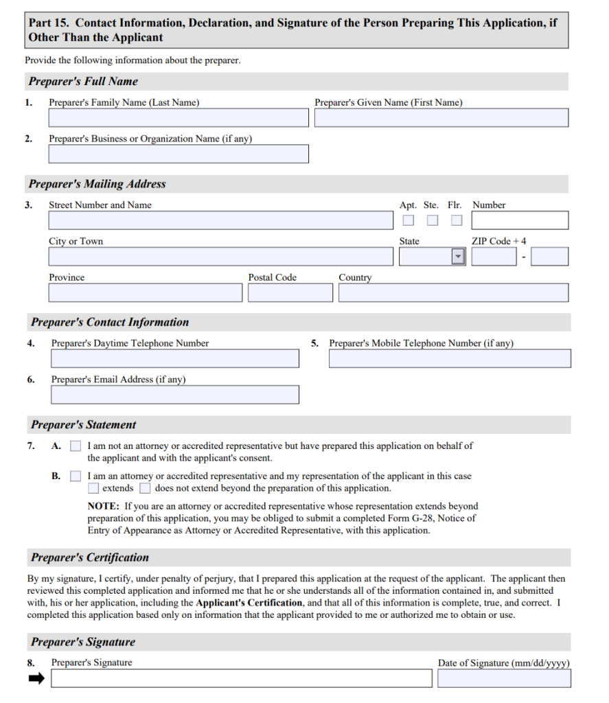 N-400入籍表格的填写样本 - Part15.代理人(如有)相关信息